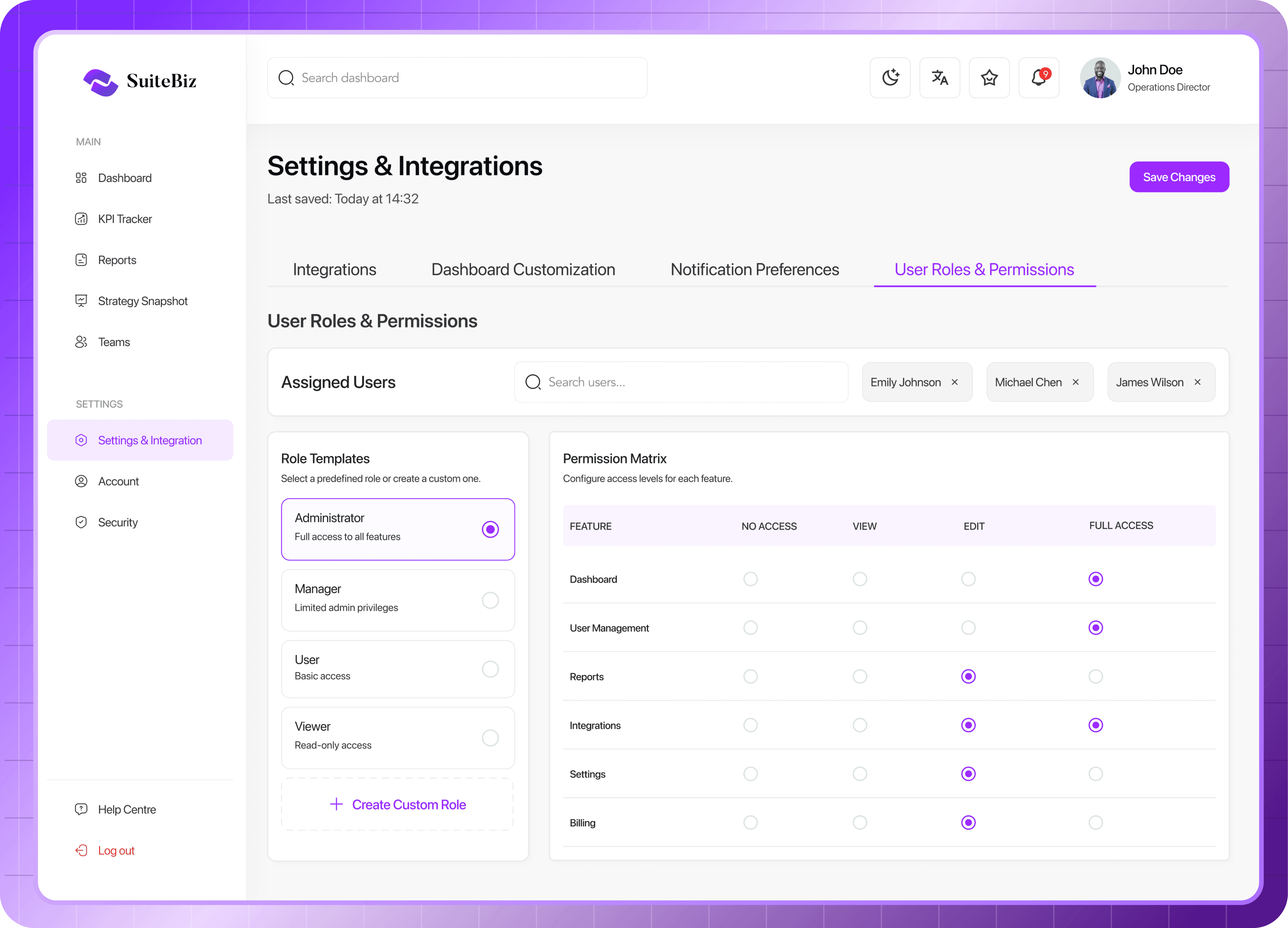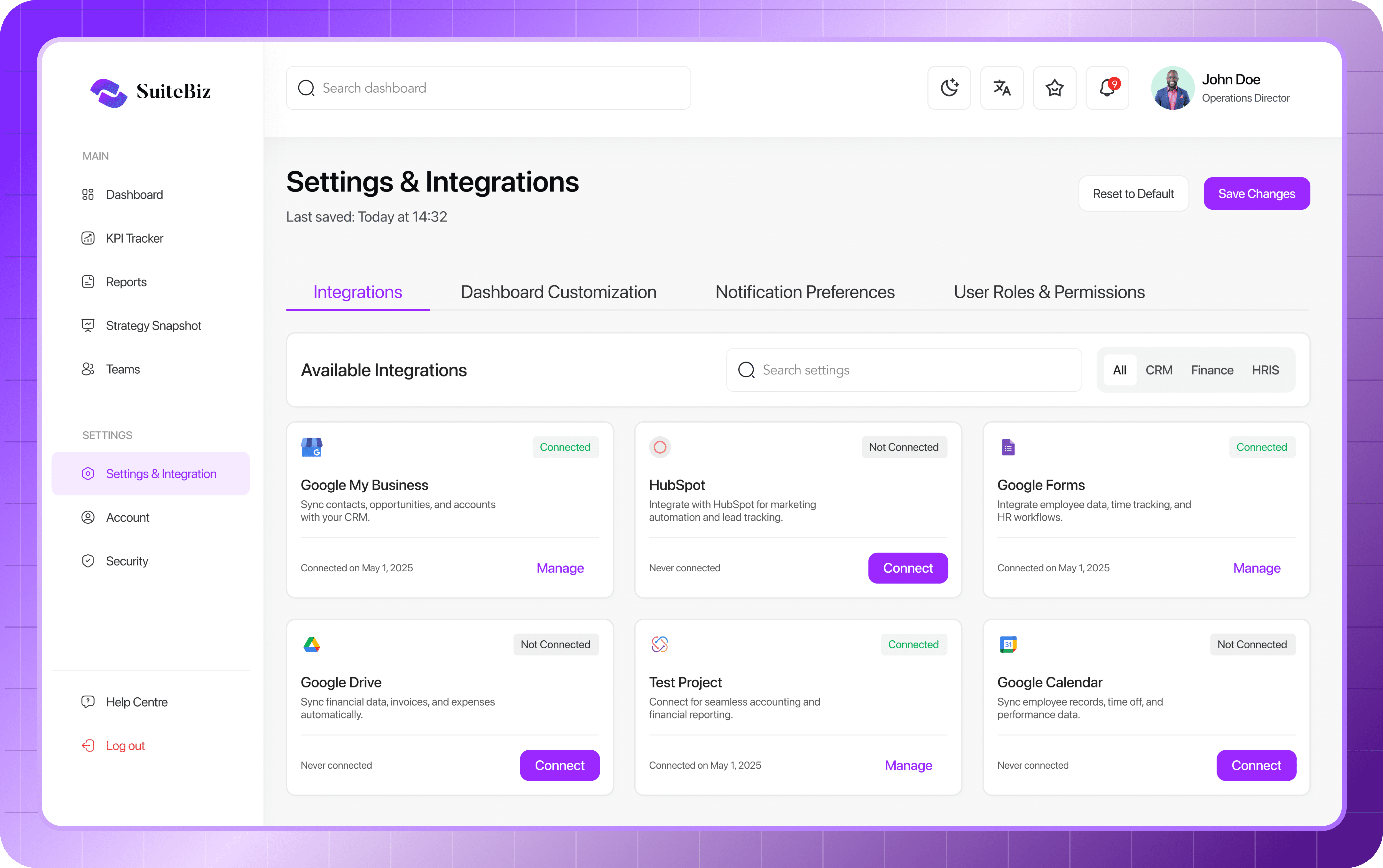Lets users customize notification settings, connect third-party tools (CRMs, HRMS, finance apps), and set up data sync preferences.