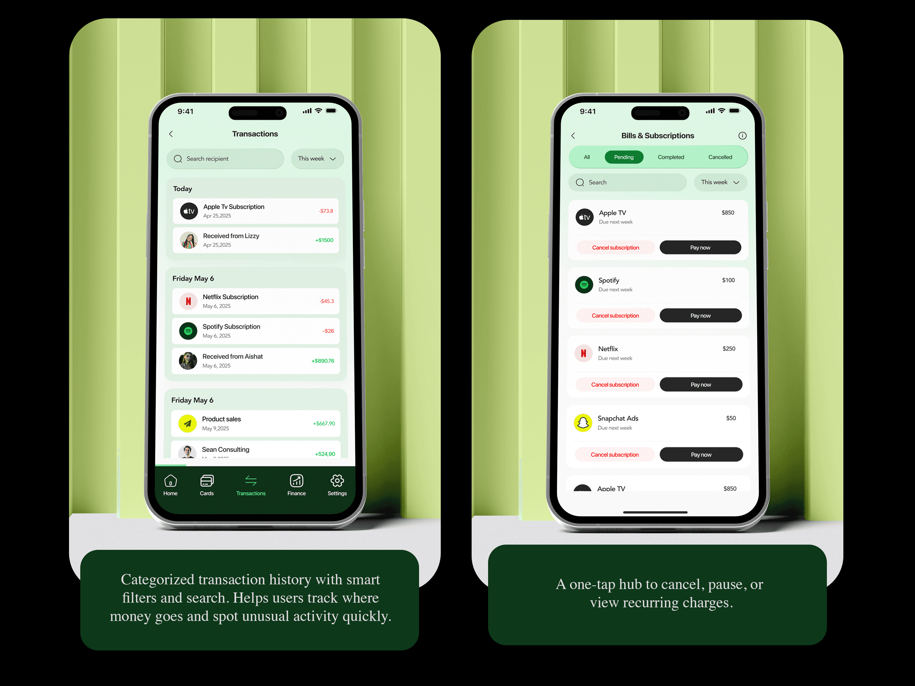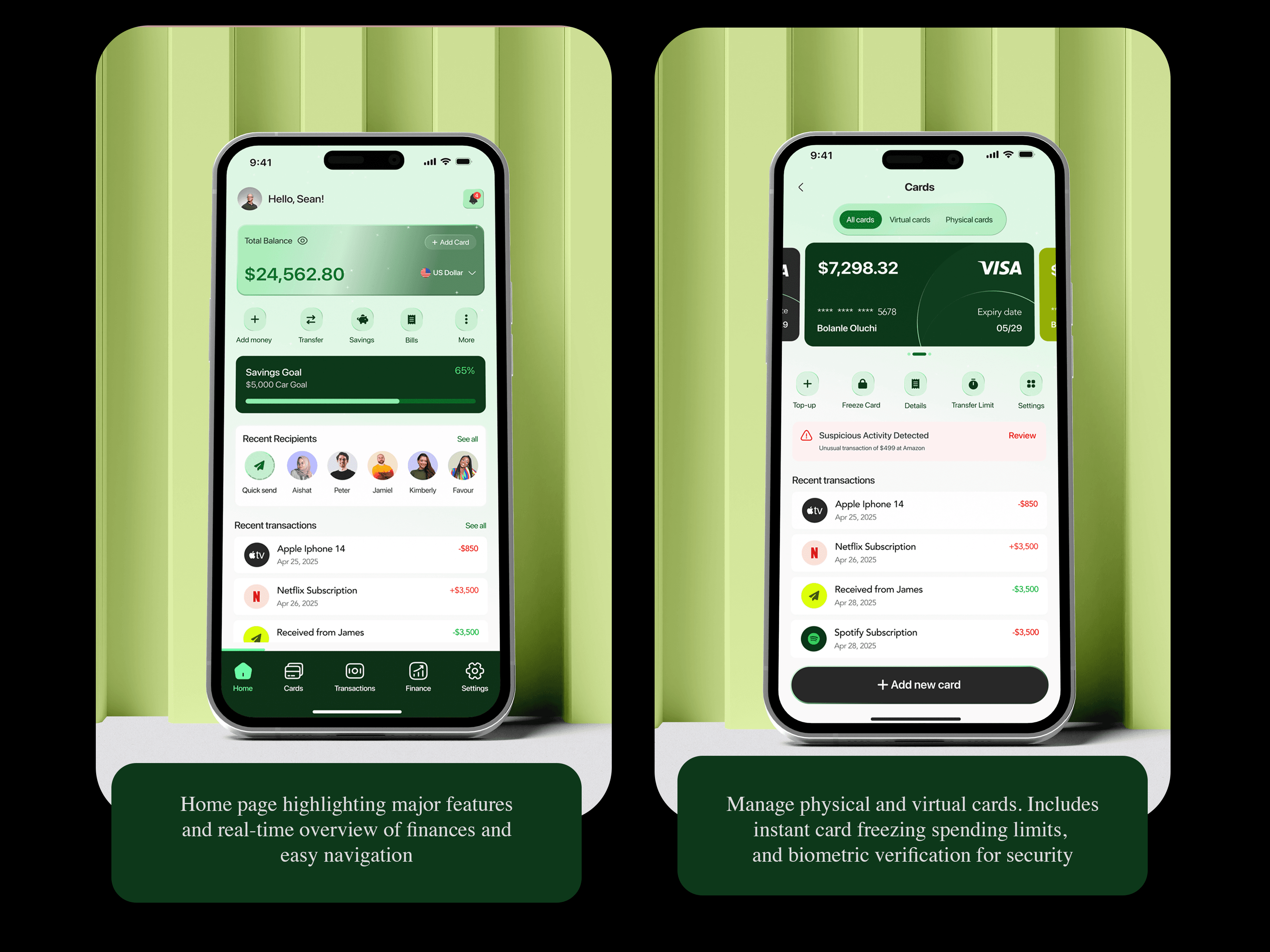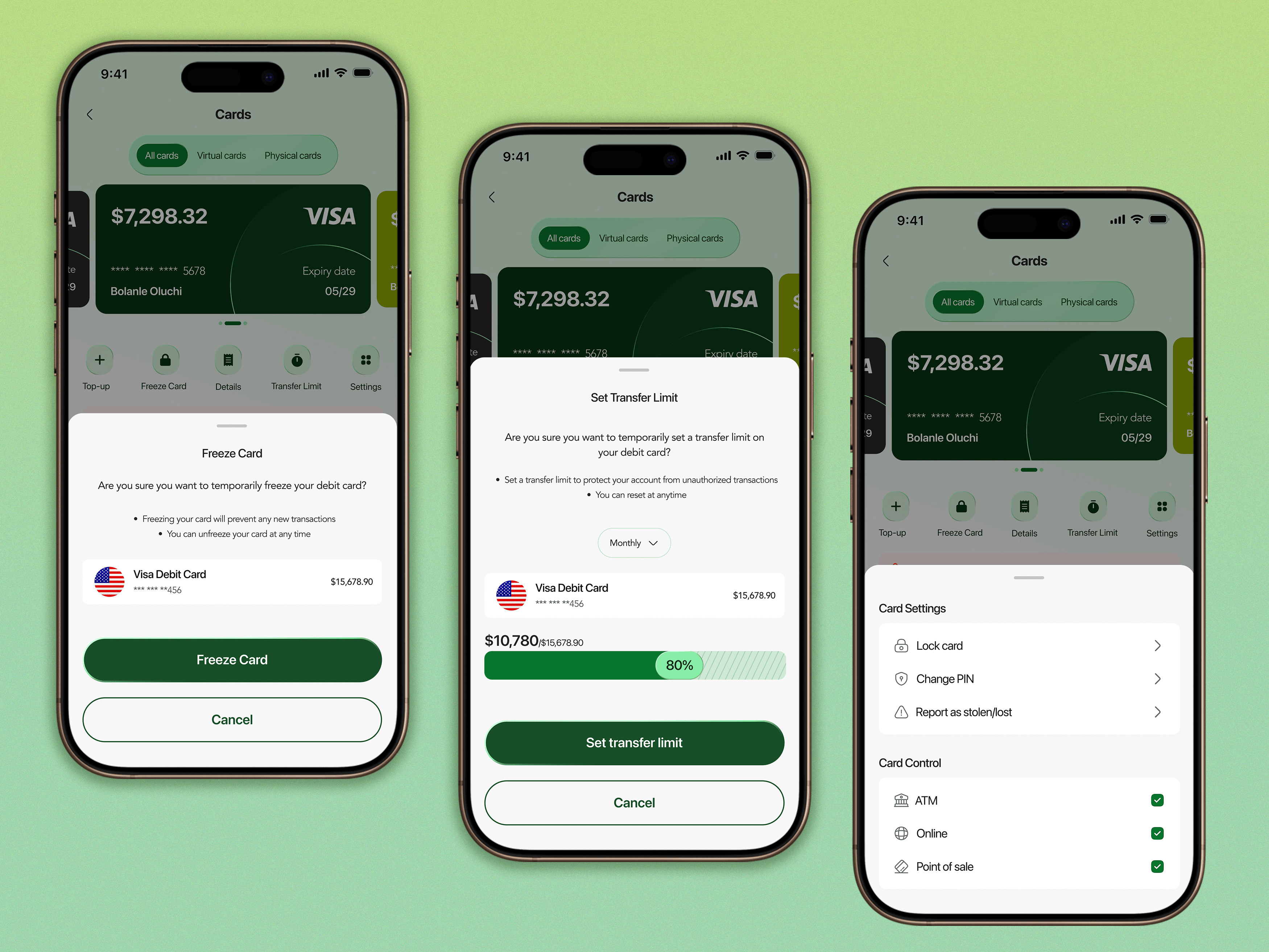 Securely view, manage, and control physical and virtual cards. Includes instant card freezing, spending limits, and biometric verification for added safety.