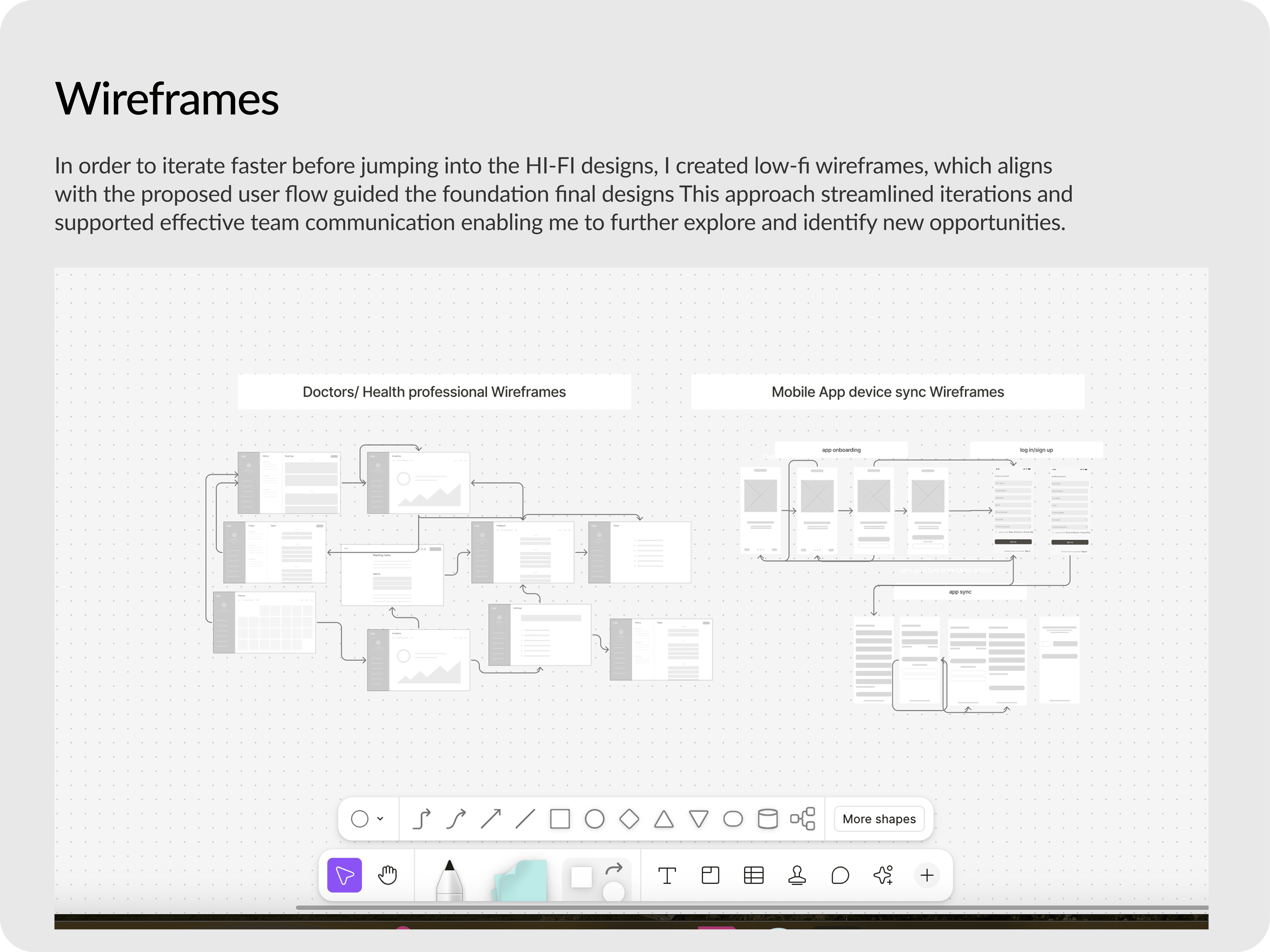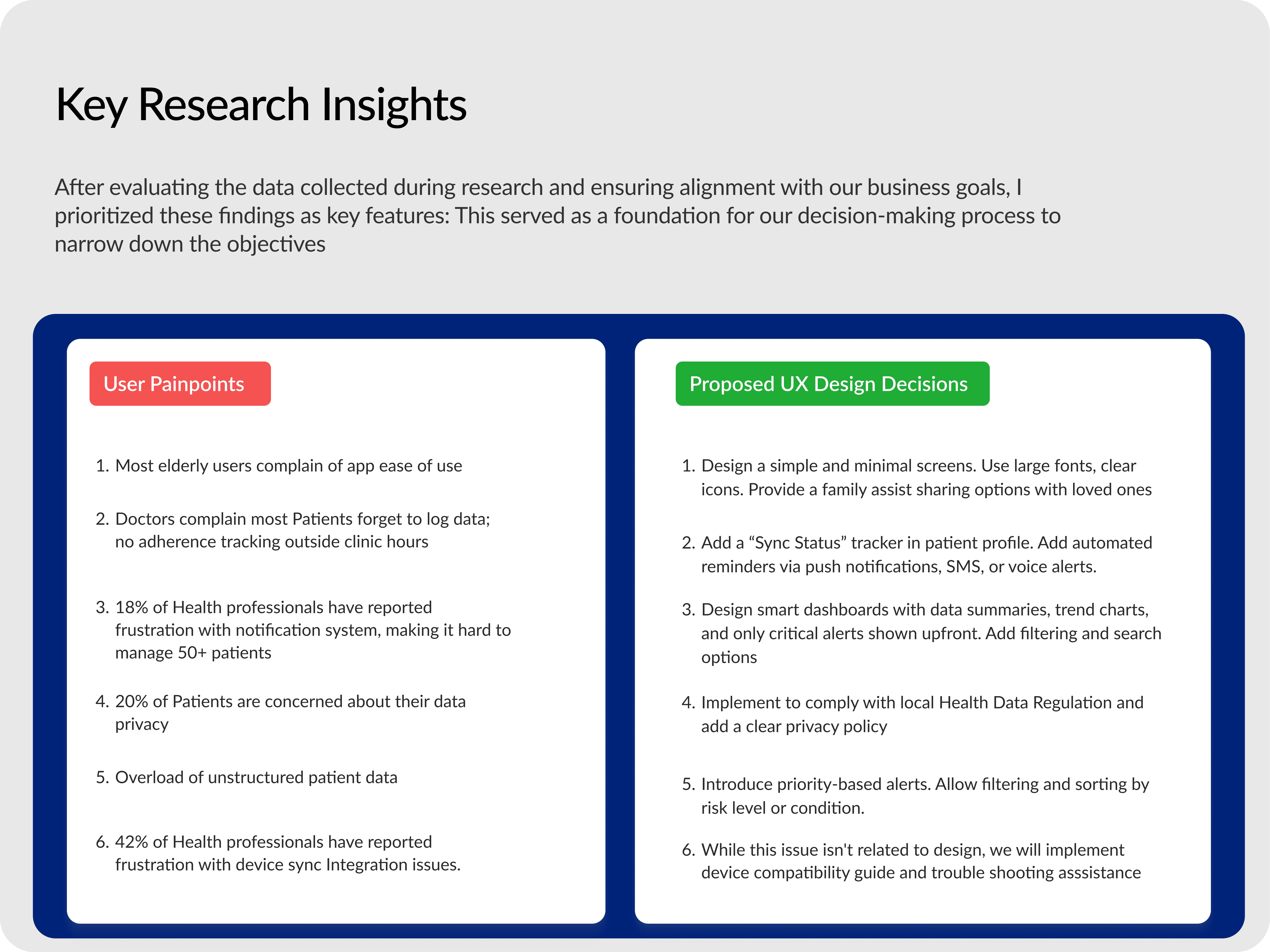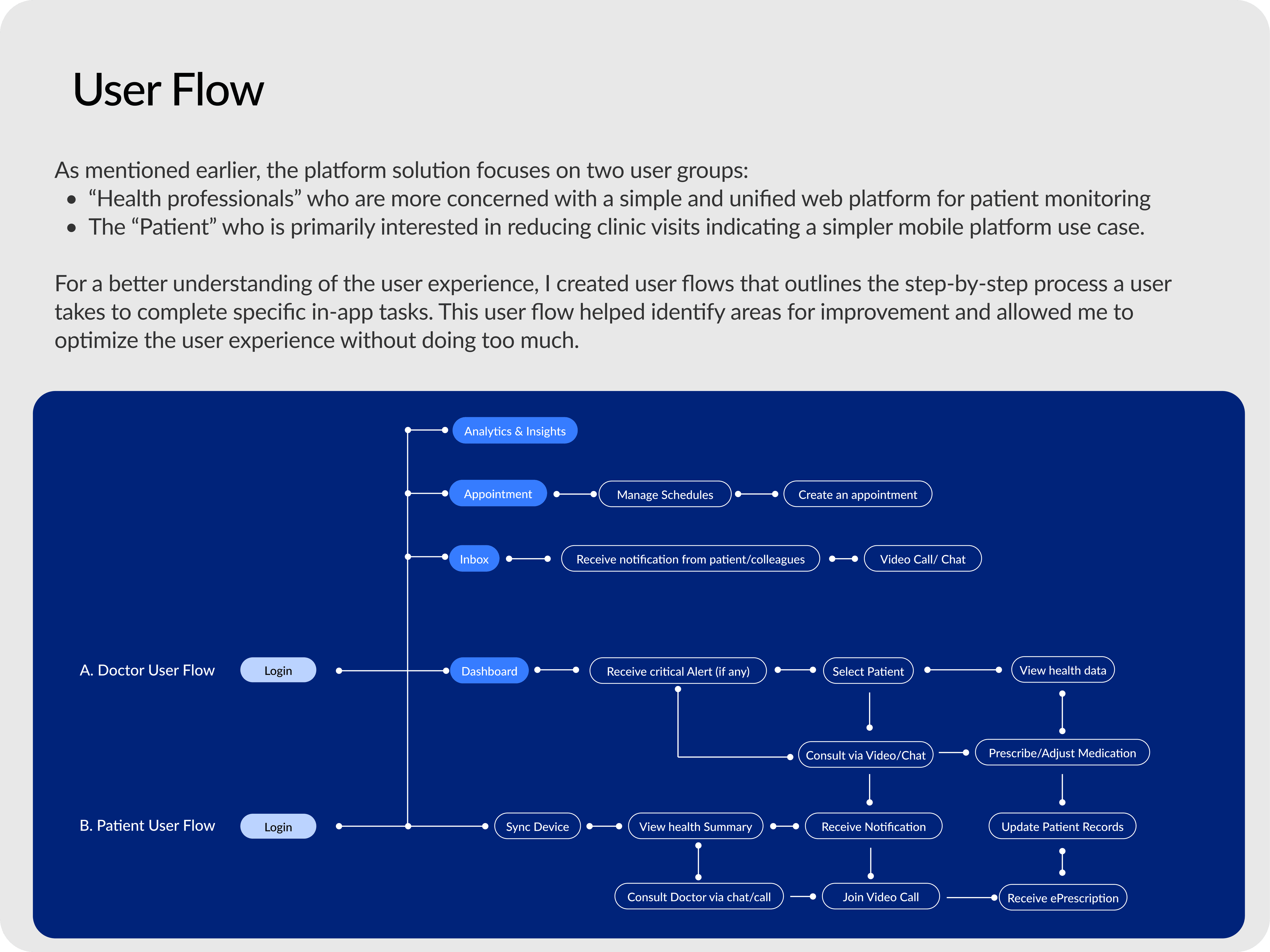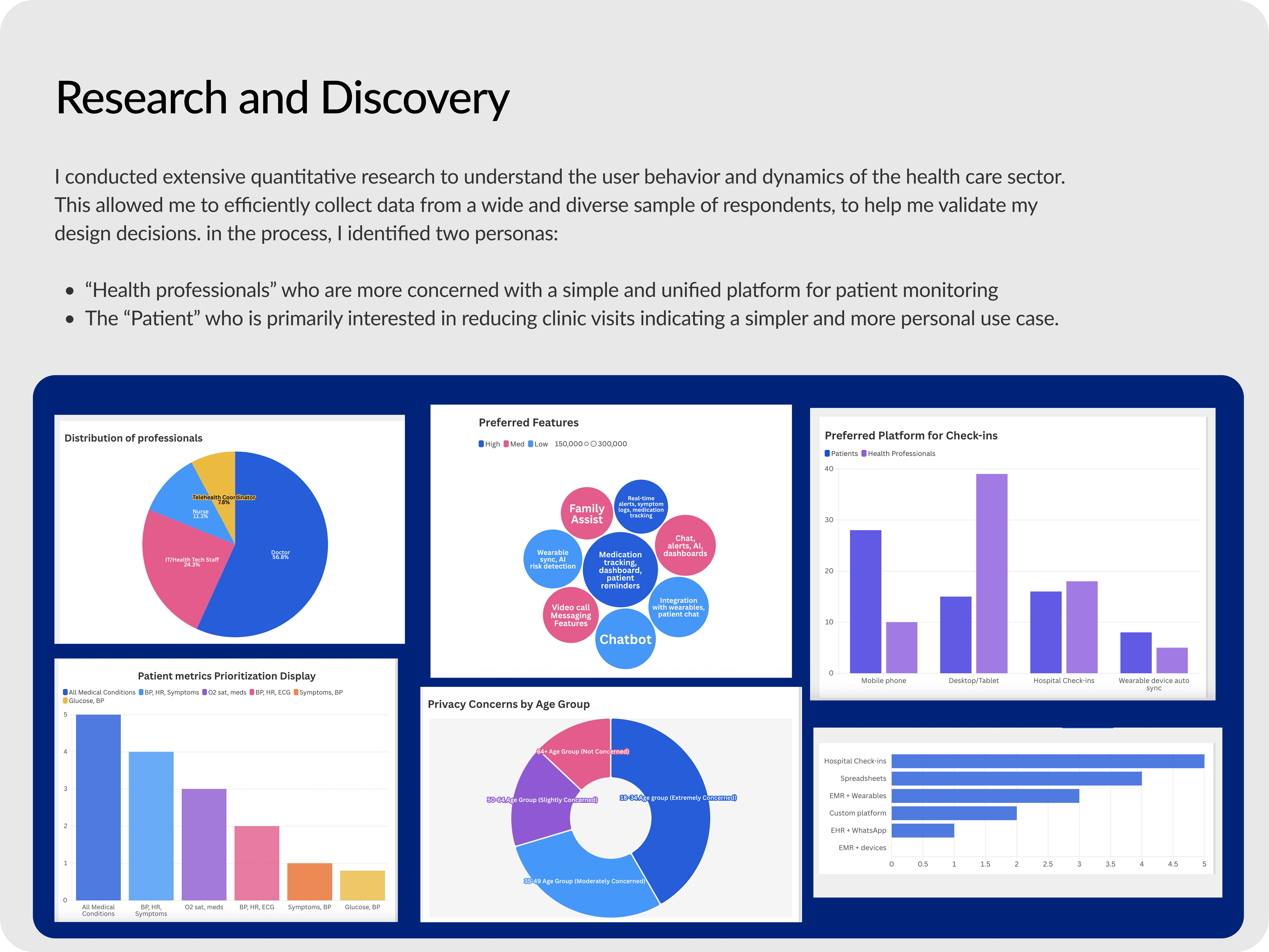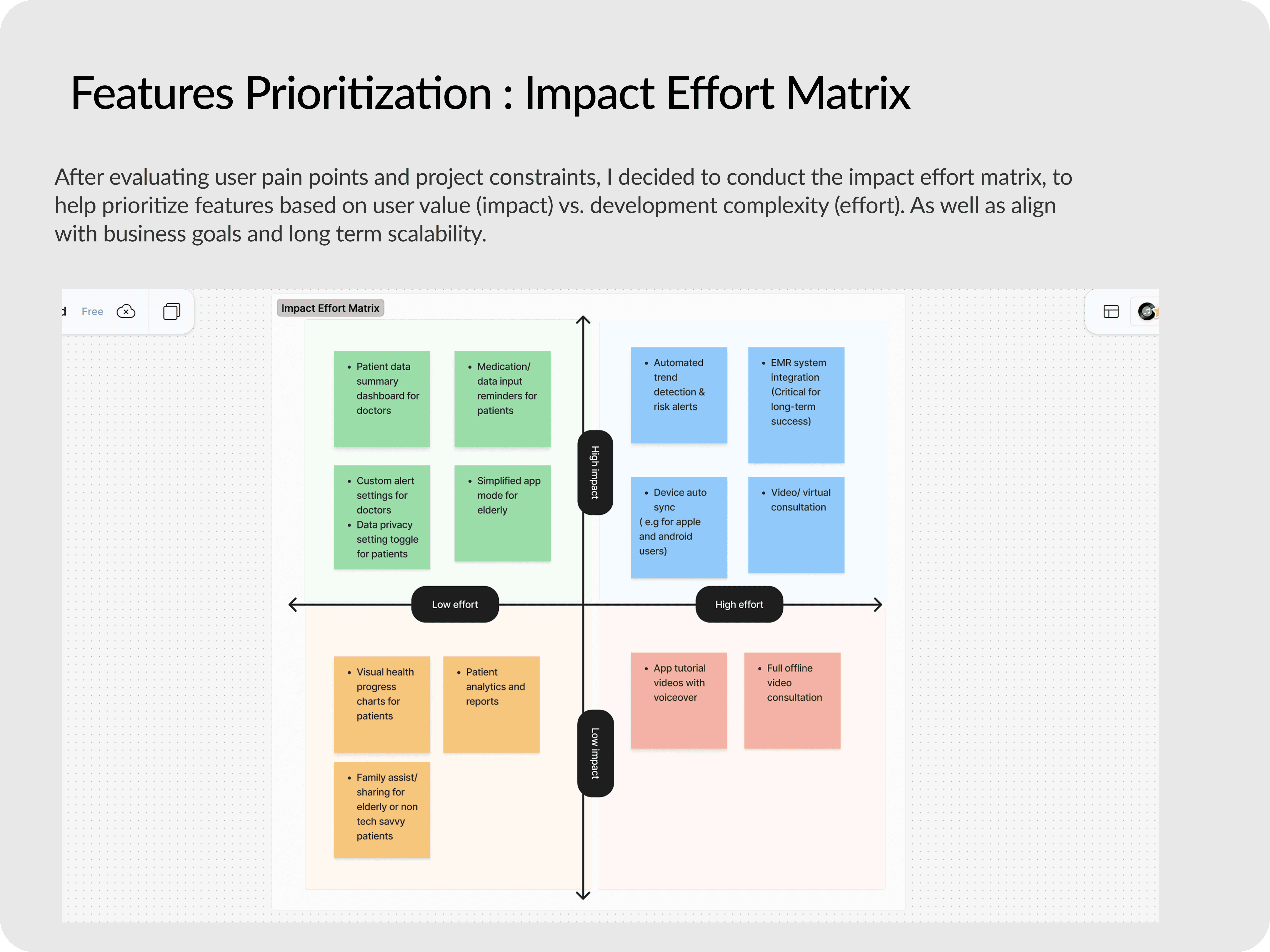 This project taught me how to balance the complexity of HealthTech with functional and intuitive design. I became a stronger communicator and UX advocate working across both patient and provider mindsets. I was able to narrow down the most important features for the first version by learning about the users and their goals they want to achieve on using the product.