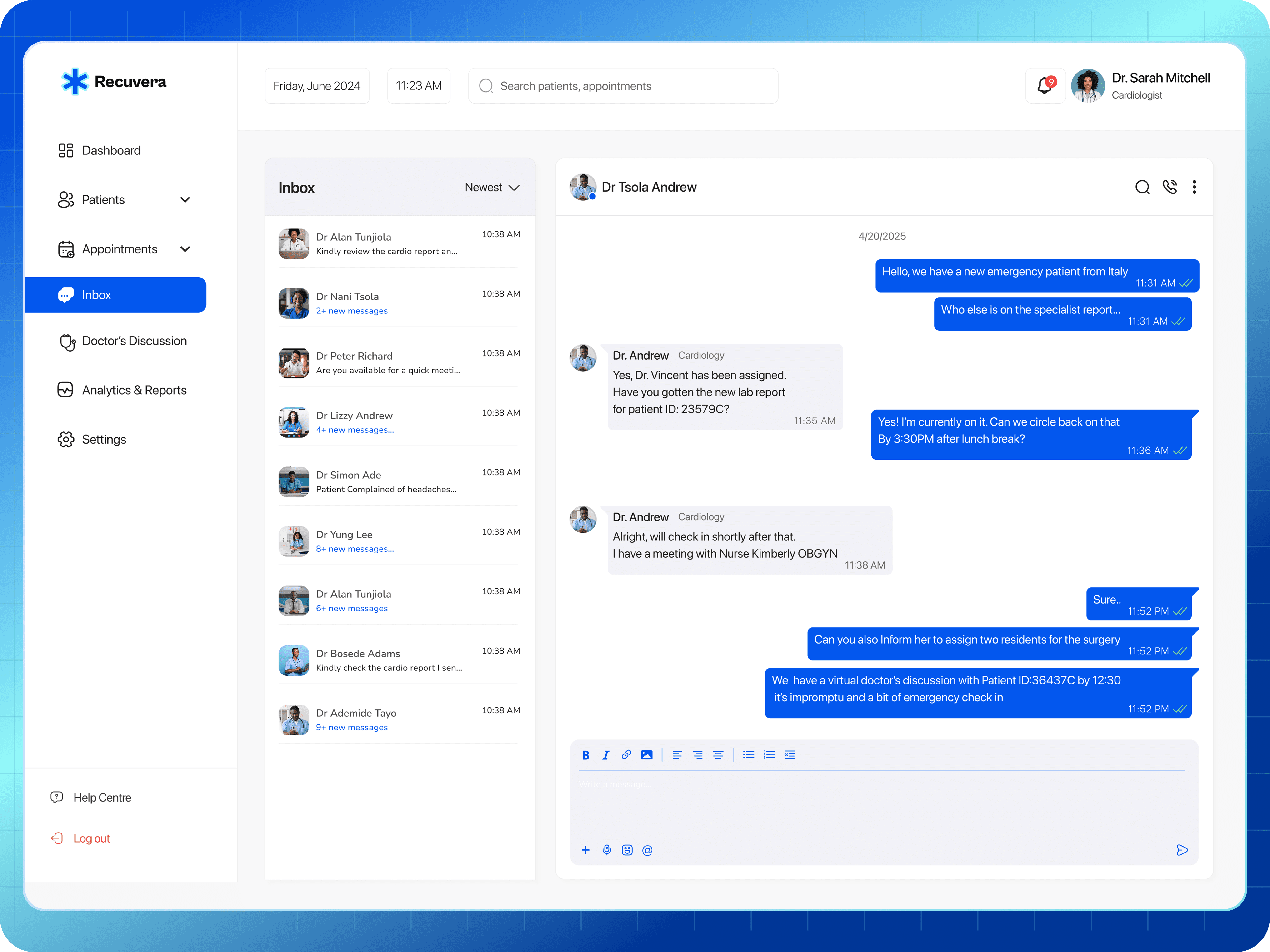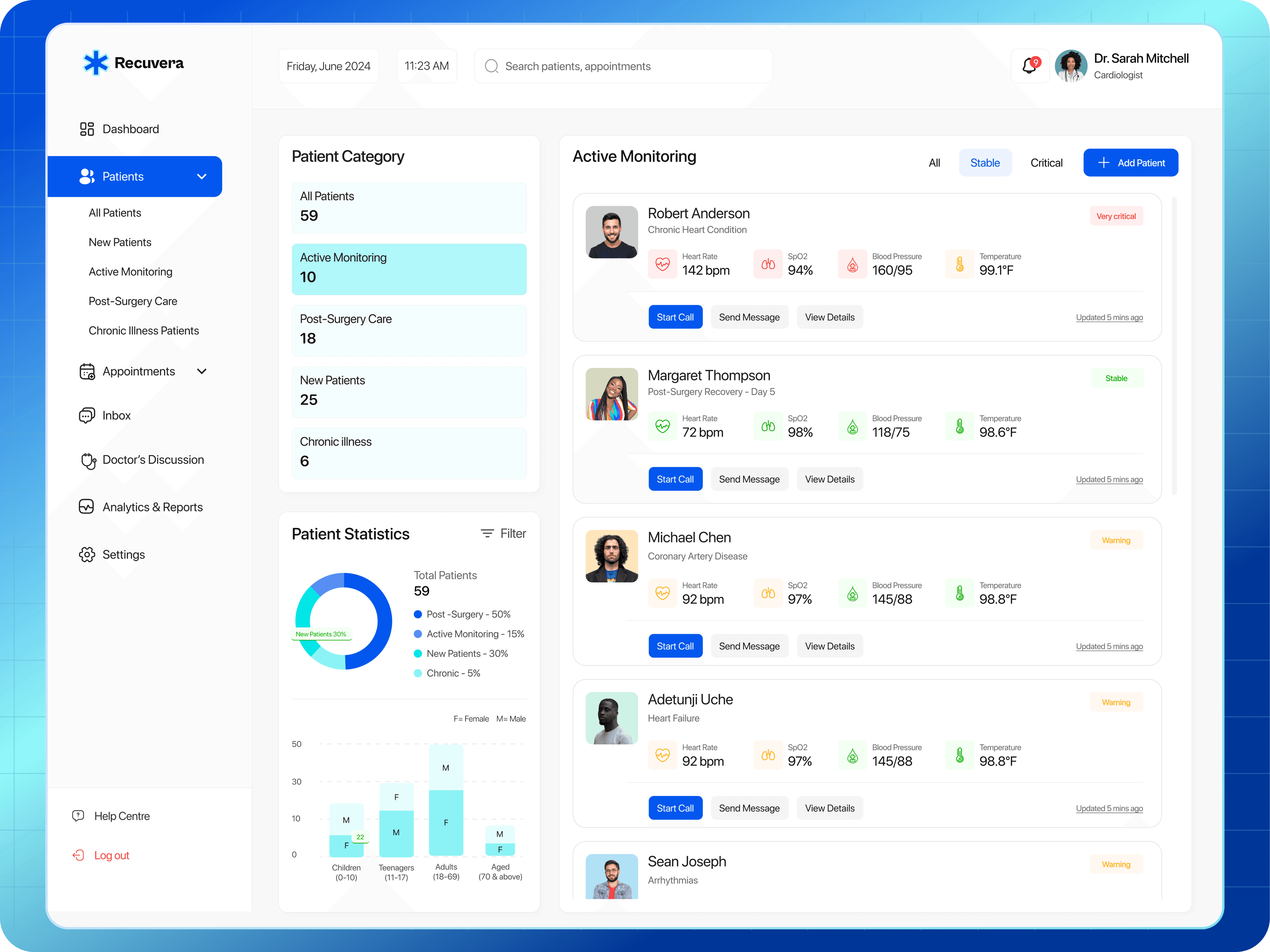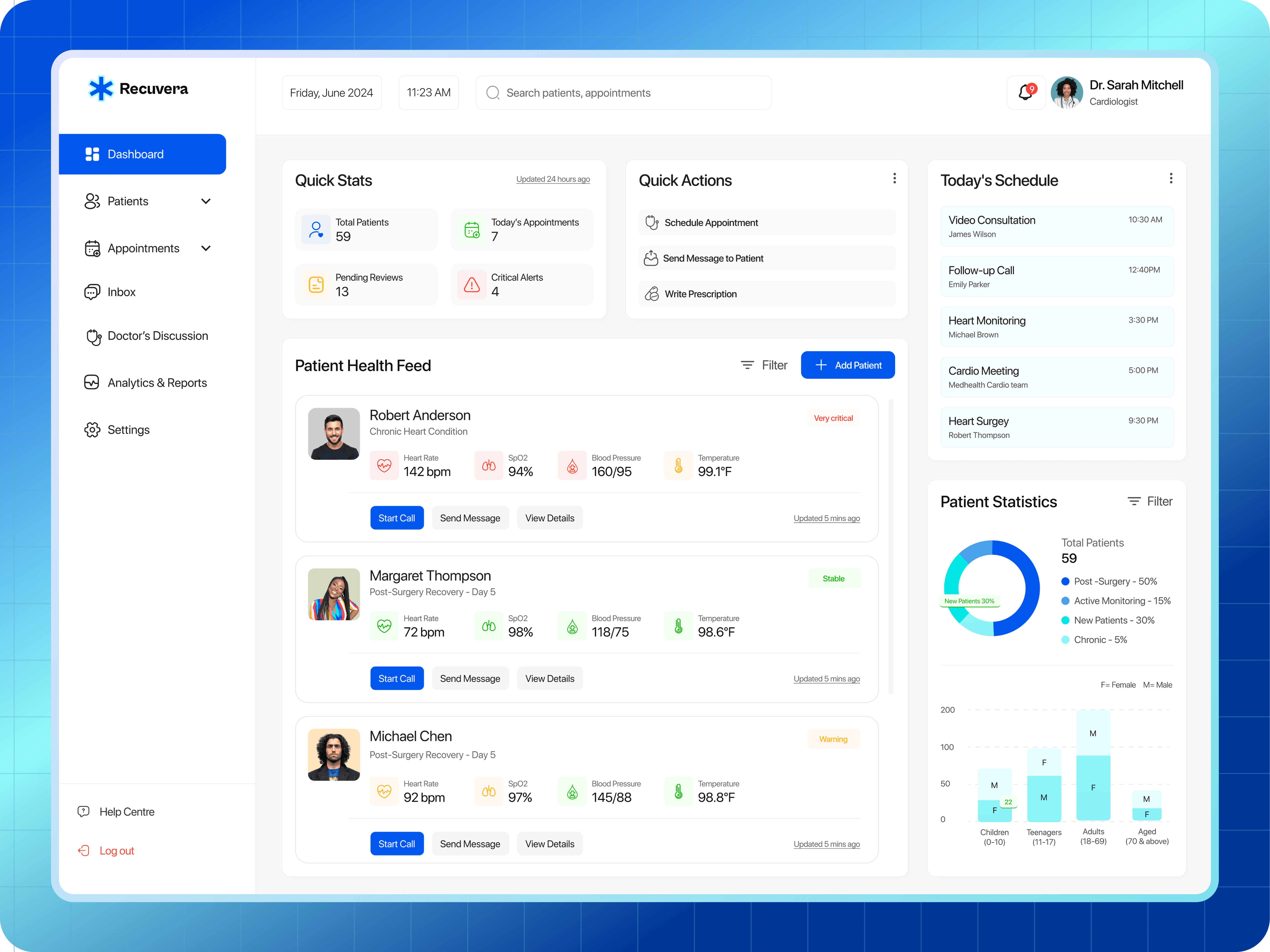 Doctors need a simple, centralized way to monitor patients remotely, especially those recovering from surgery or managing chronic illnesses, without relying on scattered tools (email, calls, spreadsheets).