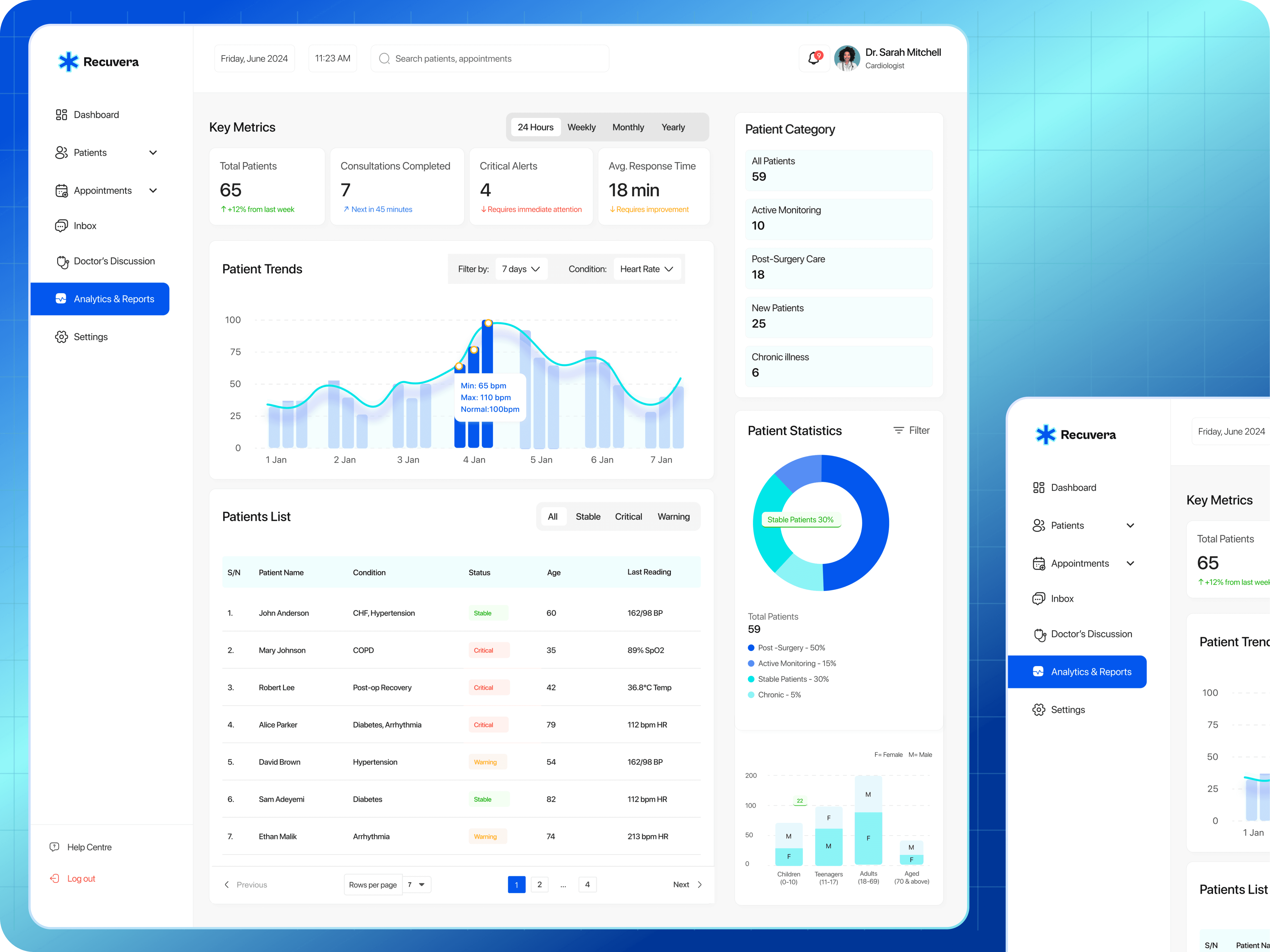 An analytics dashboard visualizing trends in patient vitals, symptom progression, medication adherence, and outcomes.